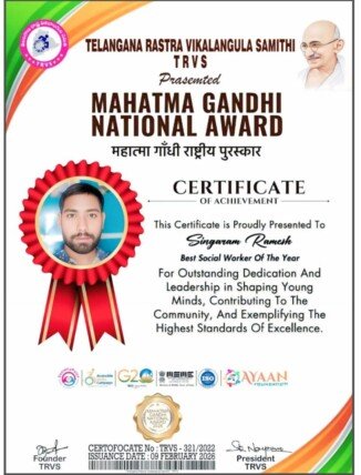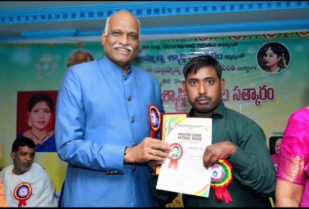 యాదగిరిగుట్ట : ఫిబ్రవరి 10, ( నేటి తెలుగు పత్రిక ప్రతినిధి ): తెలంగాణ రాష్ట్ర వికలాంగుల సమితి ఆధ్వర్యంలో ముఖ్య అతిధిగా పాల్గొన్న పసునూరి శ్రీనివాస్ నటుడు చీప్ గెస్ట్ సోమవారం రోజున రవీంద్రభారతిలో జరిగిన మహాత్మా గాంధీ జాతీయ అవార్డు మహోత్సవంలో యాదాద్రి భువనగిరి జిల్లా వికలాంగుల హెల్పింగ్ సొసైటీ ఆధ్వర్యంలో గత 2006 సంవత్సరము నుండి వికలాంగులకు అందిస్తున్న సేవలను గుర్తించి “సింగారం రమేష్” గారిని శాలువాతో ఘనంగా సన్మానించి మెమెంటో అందజేయడం జరిగింది.ఈ సందర్భంగా సింగారం రమేష్ మాట్లాడుతూ తెలంగాణ రాష్ట్ర వికలాంగుల సమితి కమిటీ వారికి ప్రత్యేక ధన్యవాదాలు తెలియజేశారు.ఈ కార్యక్రమంలో మోనార్ దుర్గ ప్రసాద్ గారు, రాష్ట్ర ప్రధాన కార్యదర్శి టి.ఆర్.వి.ఎస్ షేక్ నయీమ్, టి.ఆర్.వి.ఎస్ మోహన్ మున్నా, వ్యవస్థాపక టి.ఆర్.వి.ఎస్ గార్లు పాల్గొన్నారు.