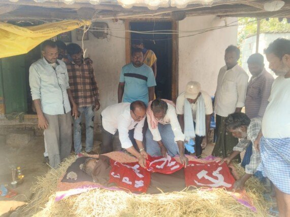 కోదాడ, ఫిబ్రవరి 12(నేటి తెలుగు పత్రిక): సూర్యాపేట జిల్లా, నడిగూడెం మండలం, రామాపురం గ్రామానికి చెందిన ,తెలంగాణ సాయుధ పోరాట యోధులు నేలమర్రి తిరపయ్య కుమారుడు సిపిఎం సీనియర్ నాయకులు నేలమర్రి రాములు అనారోగ్యంతో మృతి చెందారు. ఆయన మృతి పట్ల ,తెలంగాణ రైతు సంఘం జిల్లా నాయకులు వీరాంజనేయులు, ఏనుగుల మోహన్రావు, అప్పారావు, కృష్ణ సాగర్ వీరబాబు , పవన్ ,నేలమర్రి కోటయ్య ,తిరపయ్య , నాగేష్ , శ్రీను, శంకర్ , వెంకటేశ్వర్లు,తదితరులు నివాళులర్పించి, పార్థివ దేహం పై ఎర్రజెండా కప్పి నివాళులర్పించి ,సంతాపం తెలిపారు. రాములు మృతి కుటుంబానికి ,సిపిఎం పార్టీకి తీరని లోటు అని అన్నారు.