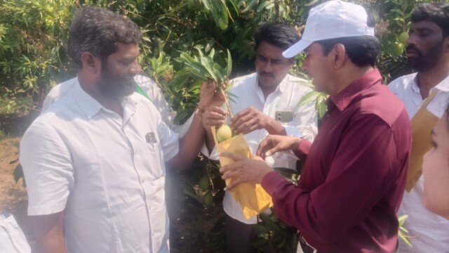 మైలవరం, ఫిబ్రవరి 12: (తెలుగు పత్రిక): ఎన్టీఆర్ జిల్లా మైలవరం నియోజకవర్గం రెడ్డిగూడెం మండలం రెడ్డి కుంట గ్రామంలో చేబ్రోలు బ్రదర్స్ మామిడి తోటల్లో కట్టిన ఫ్రూట్ కవర్స్ ను జిల్లా కలెక్టర్ జి లక్ష్మీశ గురువారం నాడు పరిశీలించారు. రైతులతో కలిసి పరిశీలించిన అనంతరం కలెక్టర్ ఫ్రూట్ కవర్స్ తో మామిడికి మంచి ధర, నాణ్యమైన మామిడి మరియు చీడపీడల నుండి రక్షణ కలుగుతుందనీ కలెక్టర్ లక్ష్మీశ పేర్కొన్నారు. ఈ సందర్భంగా ఆయన మాట్లాడుతూ రైతులు సేంద్రియ వ్యవసాయంపై ముక్కువ చూపాలన్నారు. ముందస్తుగా వచ్చిన మామిడికి ఫ్రూట్ కవర్స్ కట్టిన రైతులను ఆయన ప్రశంసించారు. రెడ్డిగుంట గ్రామ రైతులును ఇతర రైతులు ఆదర్శంగా తీసుకుని ఫ్రూట్ కవర్లు కట్టే విధంగా అధికారులు అవగాహన కల్పించాలన్నారు.ఉద్యానవన శాఖ ఆధ్వర్యంలో సబ్సిడీపై ఫ్రూట్ కవర్లను అందిస్తామన్నారు. ఫ్రూట్ కవర్లు కట్టిన మామిడికాయలను పరిశీలించి సంతృప్తి వ్యక్తం చేశారు. ఈ కార్యక్రమంలో తిరువూరు ఆర్డీవో కే మాధురి, తాసిల్దార్ జె సుశీల దేవి, మండల టిడిపి అధ్యక్షులు. జె వేణుగోపాల్ రెడ్డి, ఏఎంసీ వైస్ చైర్మన్ చేబ్రోలు రాజు, కిరణ్ కుమార్ రెడ్డి,చేబ్రోలు కొండ, చేబ్రోలు కృపా రాజు, కొండపల్లి పరమేశ్వర రావు, మరీదు లక్ష్మీనారాయణ, చేబ్రోలు సాంబశివరావు, పిడపర్తి రామిరెడ్డితో పాటు పలువురూ రైతులు పాల్గొన్నారు.