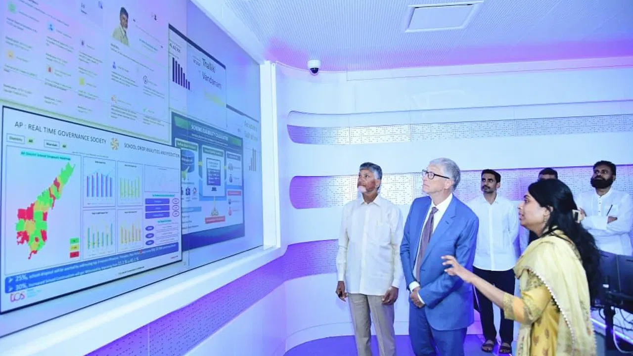 సచివాలయంలోని రియల్ టైమ్ గవర్నెన్స్ సెంటర్ (RTGS)ను బిల్ గేట్స్ సందర్శించారు. పాలనలో టెక్నాలజీ వినియోగం, రియల్ టైమ్ డేటా ఆధారిత నిర్ణయాలు ఎలా తీసుకుంటున్నారో సీఎం వివరించారు.