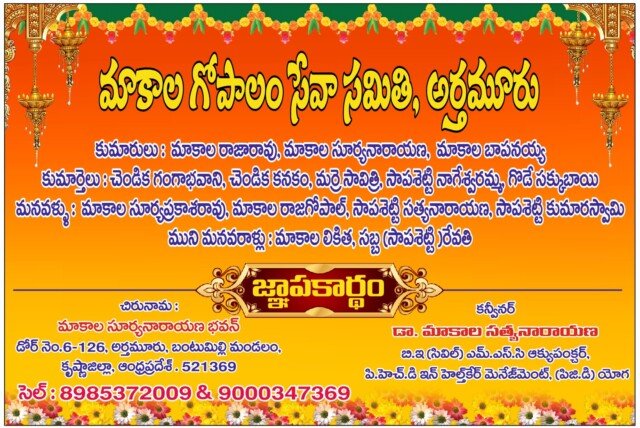 విజయవాడ. మార్చి 18 ఈస్ట్ నేటి తెలుగు పత్రిక ప్రతినిధి: మాకాల సూర్యనారాయణ భవన్లో నూతన మాకాల గోపాలం సేవా సమితి’ ప్రారంభం జరుగుతుందని సంస్థ కన్వీనర్ డాక్టర్ మాకాల సత్యనారాయణ తెలియజేశారు. ఈ సందర్భంగా విజయవాడ లో ఆయన కార్యాలయంలో ఒక ప్రకటనలో ఆయన మాట్లాడుతూ ఆరోగ్య అవగాహన సదస్సు చికిత్స శిబిరము జరుగుతుందని, ఇందులో పలువురు ఆరోగ్య నిపుణులు పాల్గొంటారని, మోకాళ్ళ నొప్పులు, నడుం నొప్పులు, మెడ నొప్పులు మొదలగు నొప్పులతో బాధపడుతున్న వారు పాల్గొని చికిత్స, అవగాహన కార్యక్రమాన్ని సద్వినియోగం చేసుకోవాల్సిందిగా డాక్టర్ మాకాల సత్యనారాయణ కోరుతు న్నారు. ఉగాది సందర్భంగా పలువురికి పురస్కారాలు అందజేయనున్నట్లు తెలిపారు. చికిత్స శిబిరంలో పాల్గొనువారు సెల్ 9000347369 కు పేర్లు నమోదు ఉదయం 9 గంటల కల్ల నమోదు చేసుకోవలసిందిగ కోరటమైనది. అని సంస్థ (మాకాల గోపాలం సేవ సమితి) అర్తమూరు కన్వీనర్ డాక్టర్ మాకాల సత్యనారాయణ తెలిపారు.